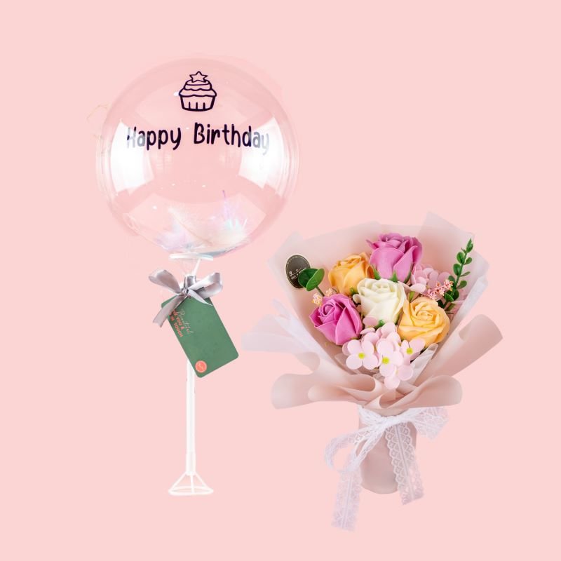 Eva Bouquet (Soap Flower) + 10″ Feather Bubble Balloon