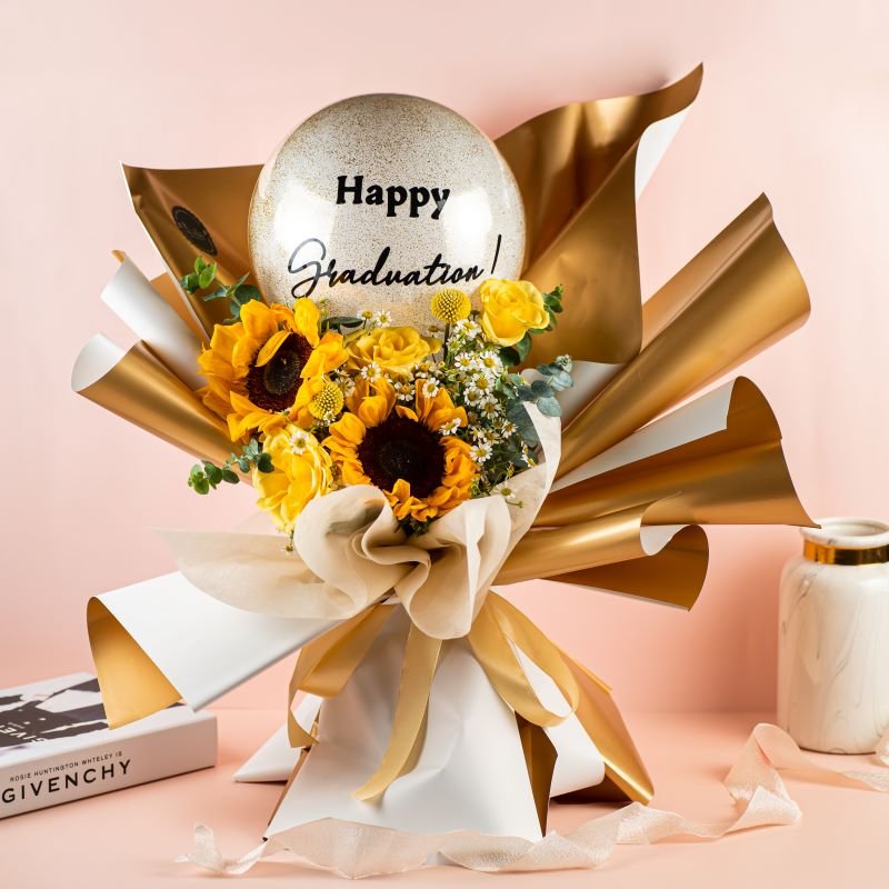 The Summer Bouquet is a lively and colorful arrangement that captures the vibrancy of the season. It features an assortment of fresh blooms in warm, sunny hues, symbolizing happiness, energy, and optimism. Each flower is carefully chosen for its freshness and visual appeal, creating a harmonious blend that brightens any room. Perfect for birthdays, thank-you gifts, or festive events, the Summer Bouquet is versatile and full of charm. Presented in beautiful wrapping, it is ready to impress upon arrival. Its combination of fragrance, color, and thoughtful design ensures it will be remembered fondly by the recipient. 2 Imported Sunflower, 3 Yellow Roses comes with 2 Craspedia, Eucalyptus & 5 Stalks of Chamomile wrapped with premium 2 tone wrapper White & Gold & Tissue wrapper. 10″ Bubble Balloon stuffed with Gold Glitter,